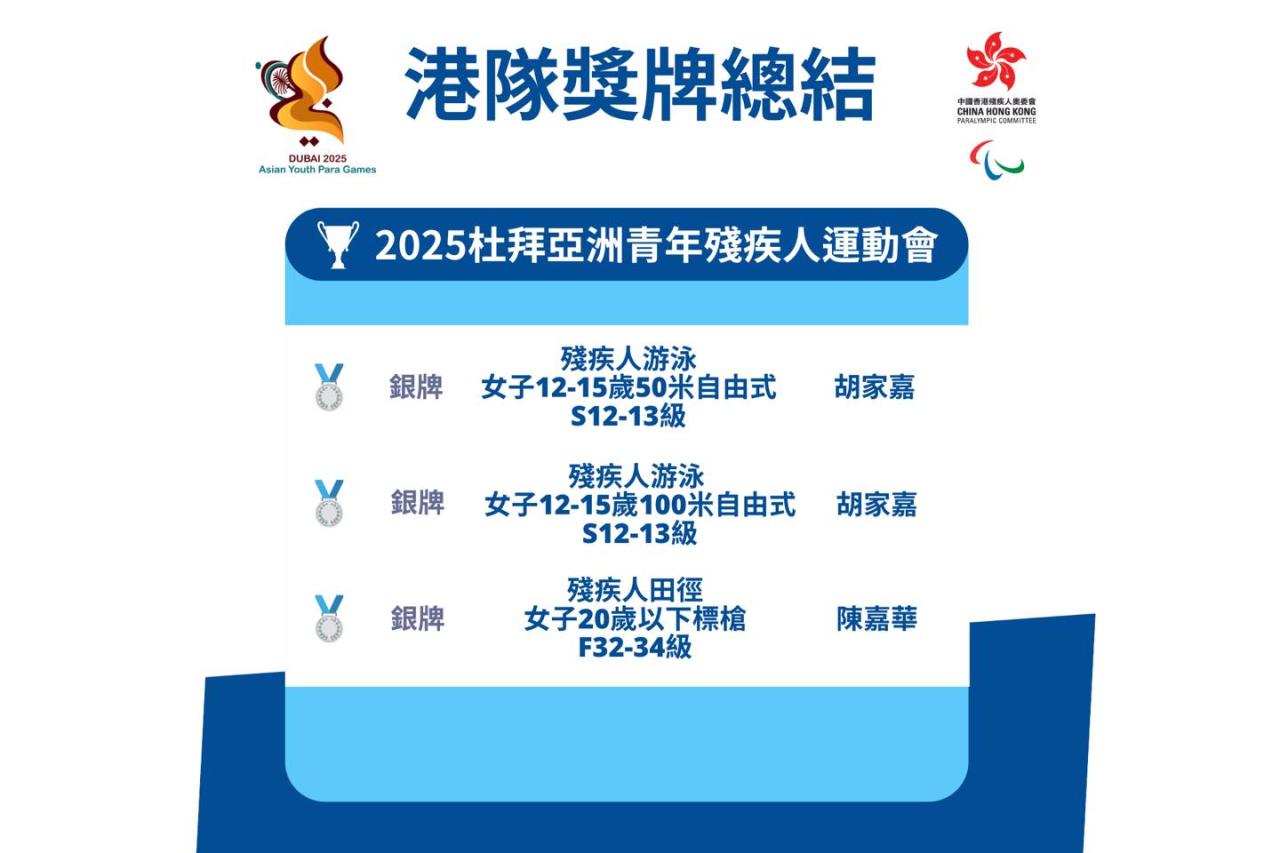 2025-12-14 杜拜2025亞洲青年殘疾人運動會已經完滿結束,總結本屆成績,中國香港共奪得3面銀牌績。銀牌 - 殘疾人游泳 - 女子12-15歲50米自由式S12-13級 - 胡家嘉銀牌 - 殘疾人游泳 - 女子12-15歲100米自由式S12-13級 - 胡家嘉銀牌 - 殘疾人田徑 - 女子20歲以下標槍F32-34級 - 陳嘉華 是次運動會中國香港派出12名運動員,競逐殘疾人田徑、殘疾人羽毛球、殘疾人游泳及殘疾人乒乓球四個項目。
