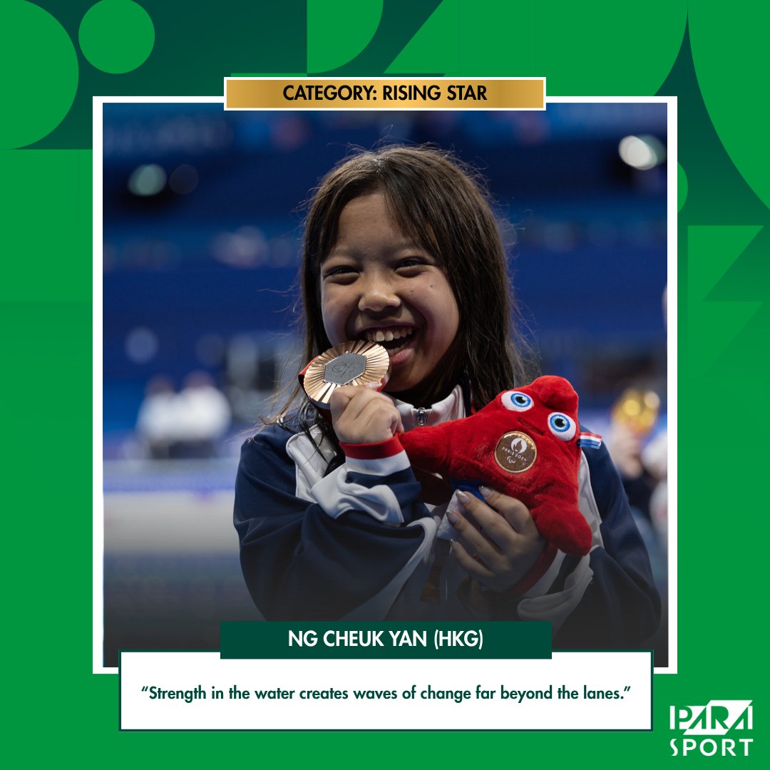 2025-11-19 現年15歲的吳卓恩於年僅13歲踏上國際舞台,首次出戰杭州2022亞殘運會,便於女子S6級100米背泳奪得銅牌。其後,更在去年巴黎2024殘奧會 女子 SB6級100米蛙泳勇奪銅牌,成為香港歷來最年輕的殘奧會獎牌得主。今次得獎更是首位香港運動員獲此國際榮譽。關於 Rising Star Award獎項由 國際殘疾人奧委會 設立,旨在表揚年輕殘疾運動員於國際賽事上展現卓越成績及潛力。得獎者須由各國家或地區殘奧會或以成員機構提名,並經 國際殘奧會 評選程序選出,被視為「殘奧界明日之星」。