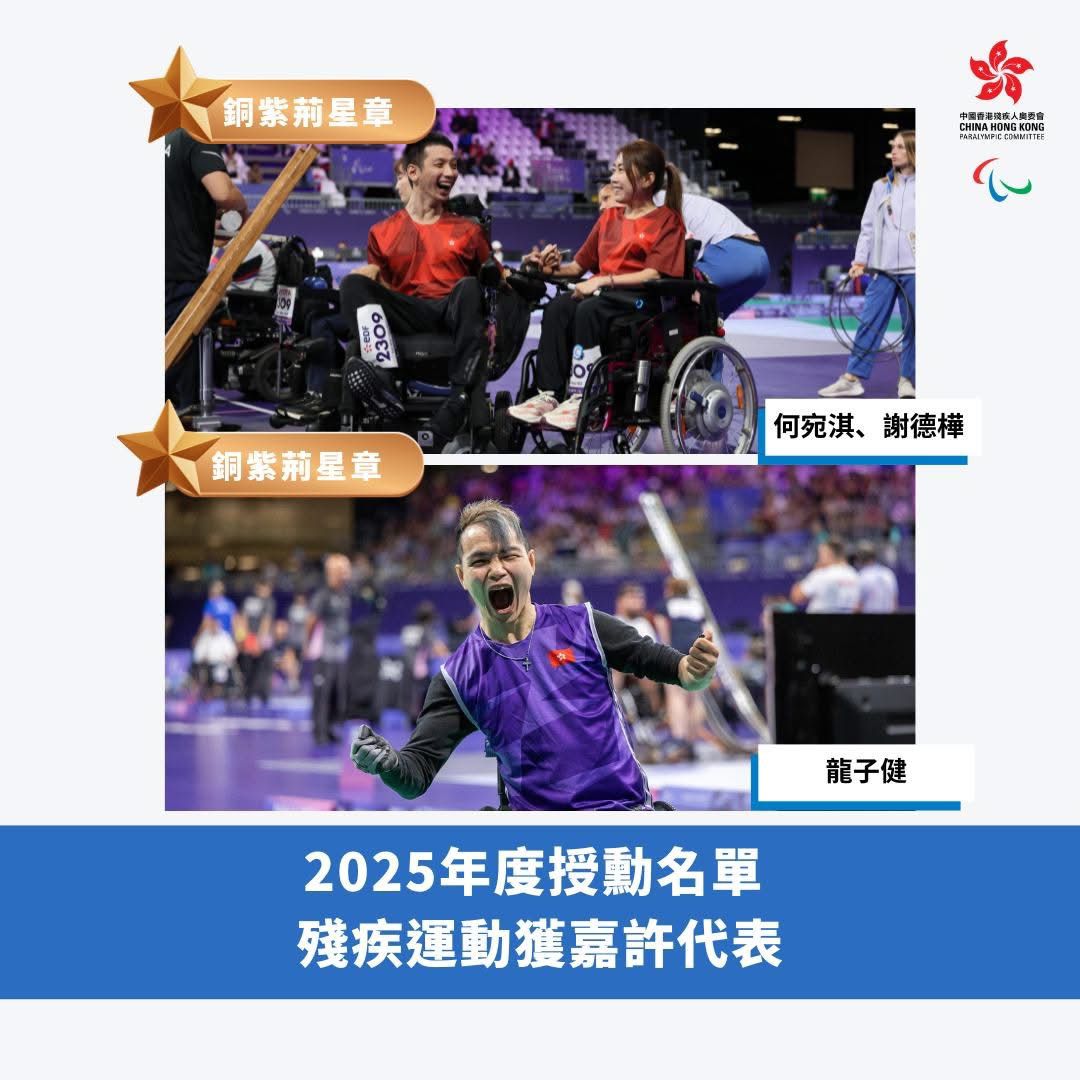 同樣在於巴黎殘奧獲獎牌的運動員,包括女子S14級100米蝶泳銀牌得主陳睿琳、包辦兩面硬地滾球銀牌的張沅及女子S6級100米蛙泳銅牌得主吳卓恩則獲授榮譽勳章。另外,殘疾人羽毛球隊總教練陳仁傑、殘疾人游泳(智障)教練梁淑盈及謝德樺教練兼比賽助理的劉煒麒亦獲授榮譽勳章;另一殘疾人游泳港隊教練江俊賢則獲頒行政長官社區服務獎狀。