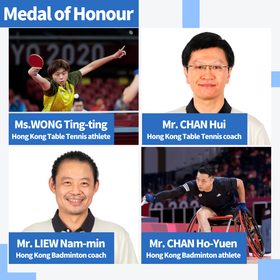 For Table Tennis, Para athlete Ms. WONG Ting-ting and coach Mr. CHAN Hui are awarded MH in recognition of their outstanding achievements in international Table Tennis competitions and Mr. CHAN’s devotion to elite training contributes to the outstanding achievements of Hong Kong athletes at international Table Tennis competitions. Also, Para athletes Mr.LEE Ming-yip and Mr. TONG Chi-ming are commended in recognition of their outstanding achievements in international table tennis competitions.