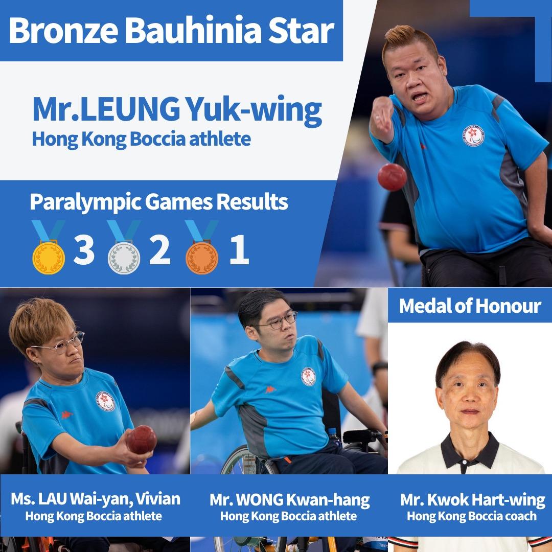 Hong Kong Boccia athlete Mr. LEUNG Yuk-wing is awarded BBS in recognition of his notable sporting achievement. He has represented Hong Kong, China, to participate in five editions of the Paralympic Games (PG) and has captured 3 Gold, 2 Silver and 1 Bronze Medals in PG for Hong Kong.