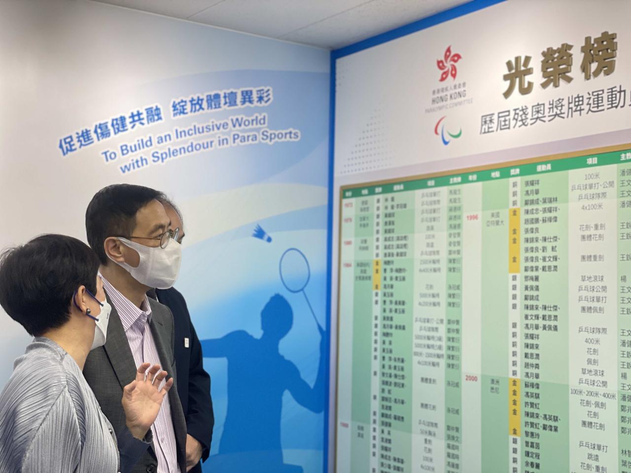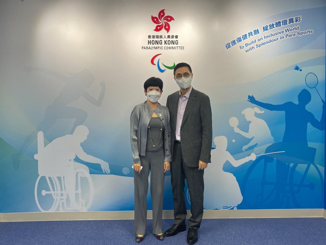 本會榮幸獲文化體育及旅遊局局長楊潤雄先生GBS JP、文化體育及旅遊局局長政治助理招文亮先生和文化體育及旅遊局首席助理秘書長鄭青雲先生到訪本會參觀並與本會董事會面。於2022年9月26日,楊潤雄先生在本會會長馮馬潔嫻女士BBS JP 及一眾董事陪同下參觀本會秘書處,了解本會自今年4月1日成立後的工作概況、商討未來如何協作推動本港殘疾運動及協助殘疾運動員退役轉型事宜等。
